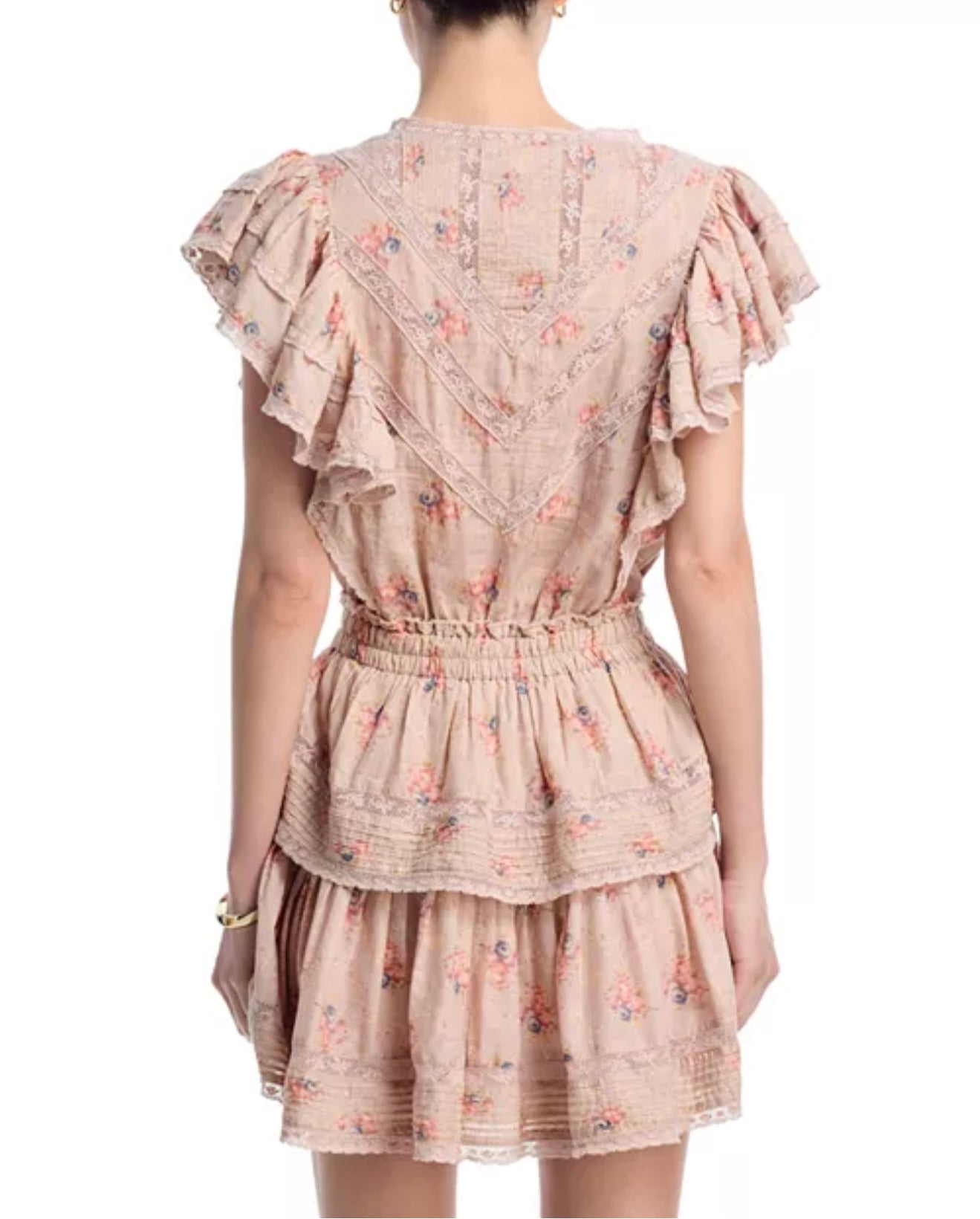 This short frock has a faux wrap top, which forms a deep v neckline. Shirred ruffles line the outer edges of the shoulder and bodice, forming flutter sleeves. The skirt is constructed just like our signature Ruffle Mini—with an elastic waist and two flounced tiers.