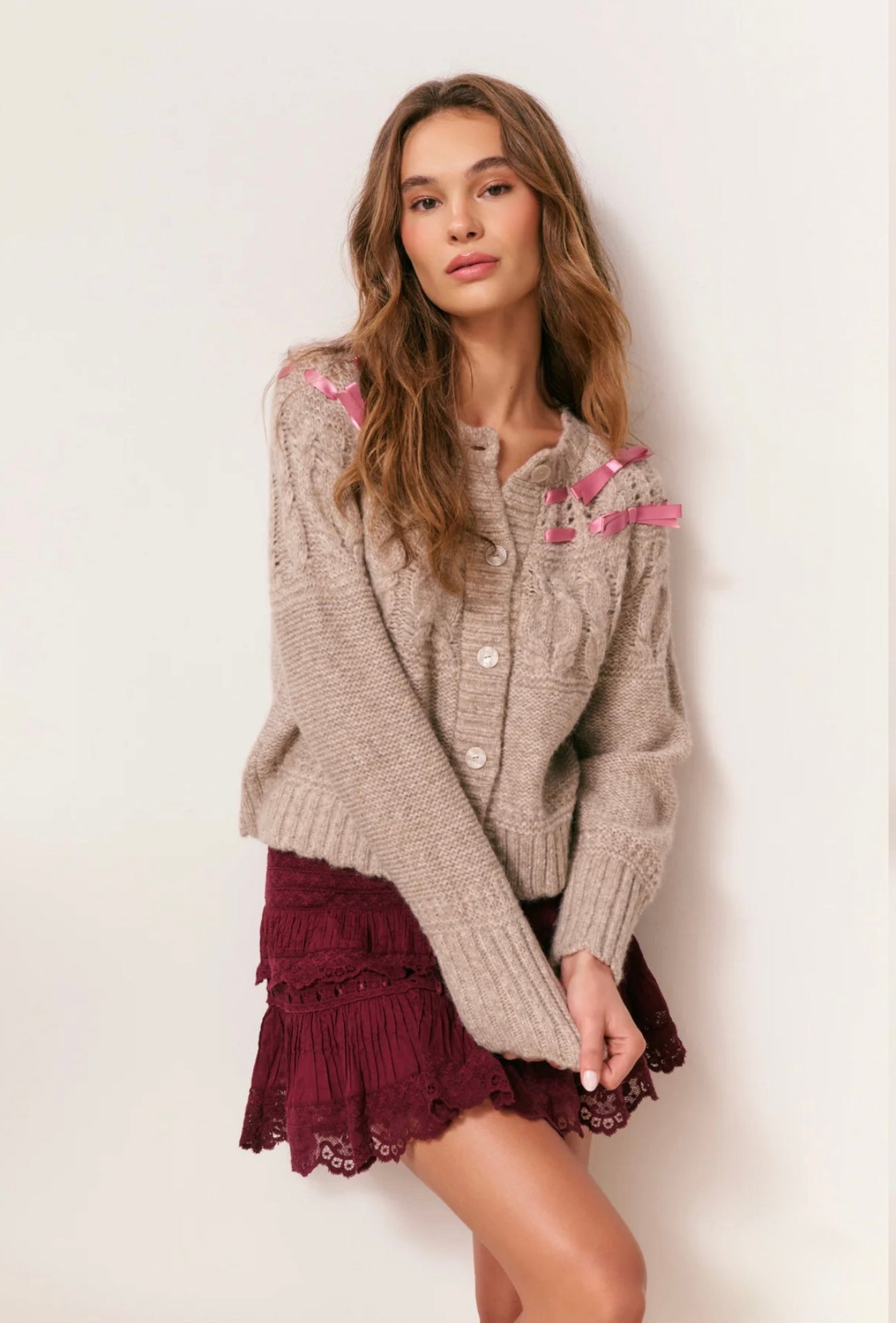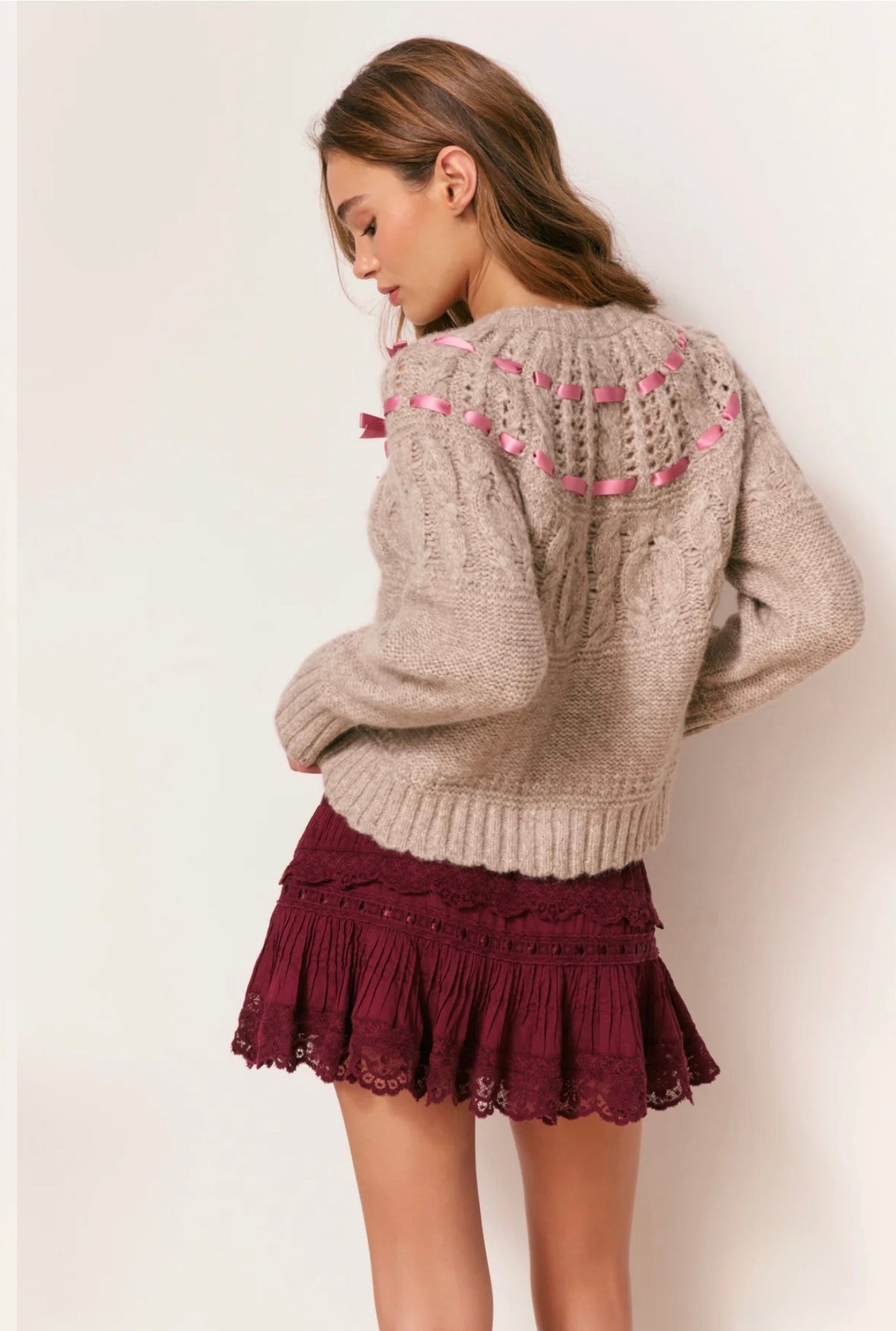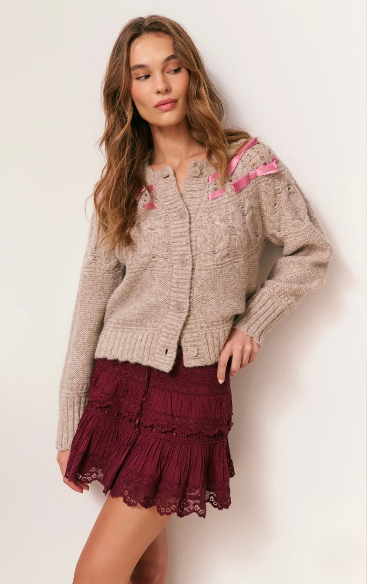 This warm, soft cardigan evokes a fair isle-inspired look reimagined through intricate lace ribbon cables, with varied cable stitches tracing the yoke for texture and dimension. Satin ribbons woven around the neckline tie into bows at the princess seams, while custom shell buttons finish the piece with delicate detail. Feminine, textured, and effortlessly dreamy, Clementian is perfect for layering over skirts, dresses, or your favorite high-waist denim.